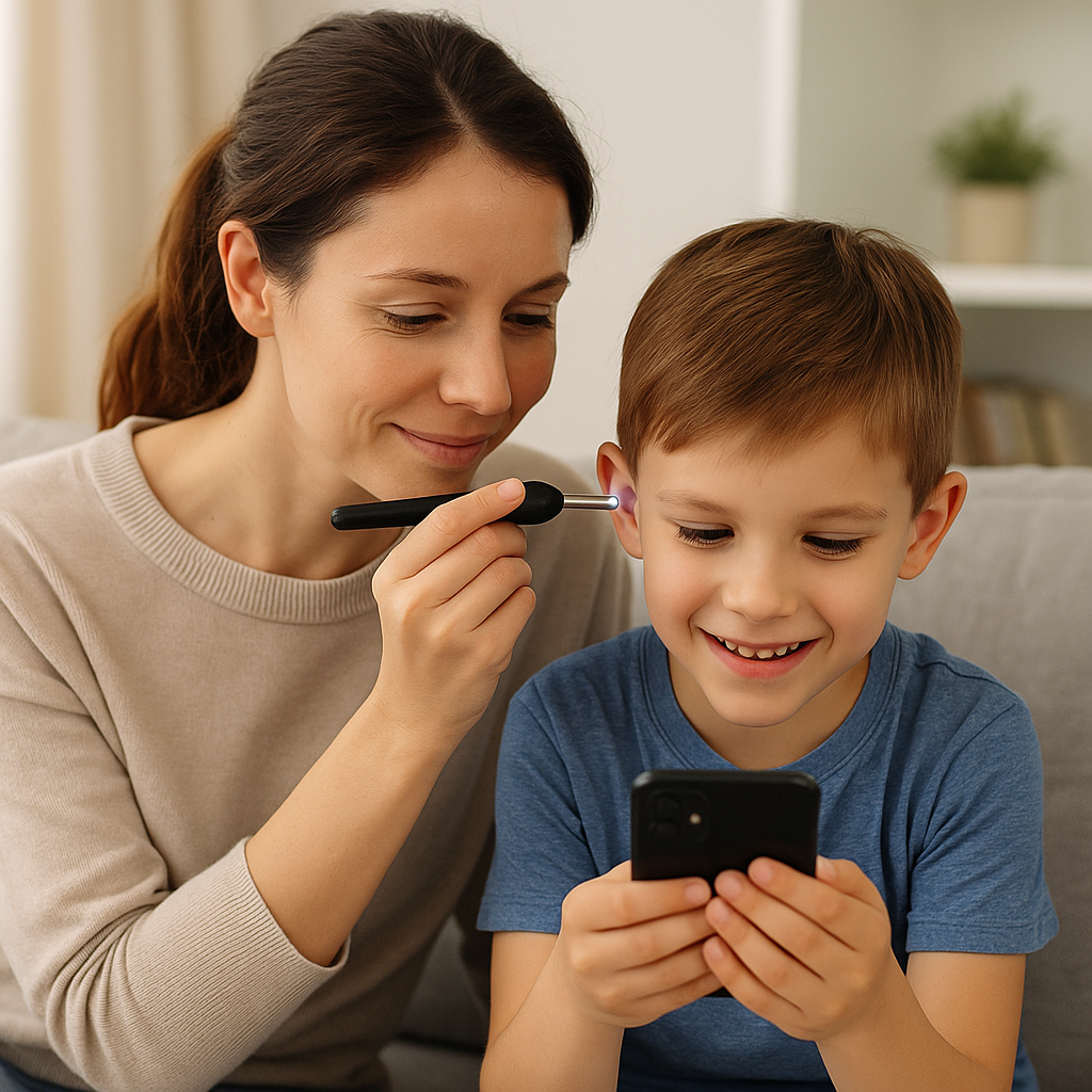 Grâce à l’otoscope connecté, visualisez en direct sur smartphone et nettoyez en douceur. Une expérience sûre, pratique et conviviale à partager en famille.